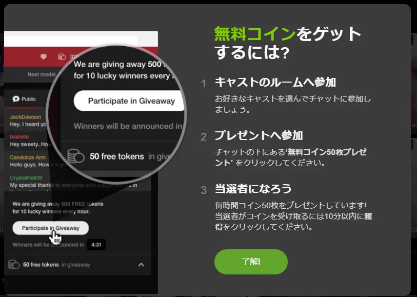 - チャットの下にある「Participate Giveaway」をクリックすると50コインが付与されます。