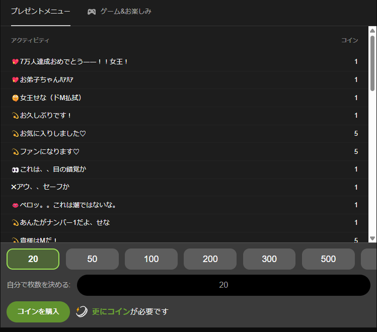 有料コインを使うとパフォーマーとコミュニケーションを楽しむことができます。
